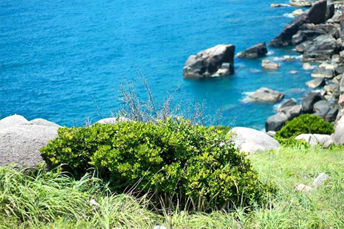 Những ghềnh đá lớn, nhỏ hài hòa với sắc xanh của biển, trời xanh thẳm, và cả thảm thực vật tươi tốt.